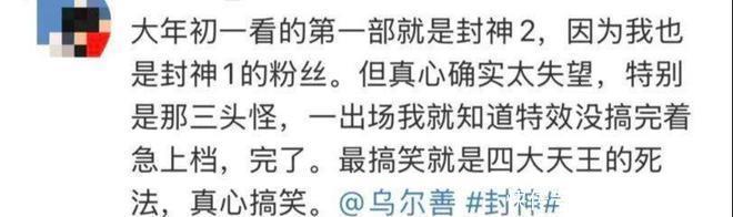 的确,不雅众复旧《封神》第二部,是基于对第一部的信任,是但愿电影越来越好,终了第二部端上来的根蒂就不是好饭,而是馊饭,这让不雅众怎么可能有好模式呢?