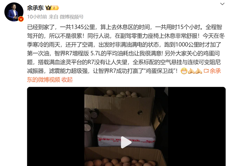 春节年前,余承东开着享界S9从深圳回到安徽故土霍邱,而年后初三,余承东再次开启了自驾回程之旅,只不外这一次开着的是智界R7回深圳,何况莫得了直播,然而在自驾进程中,余承东共享了我方的行程体验。