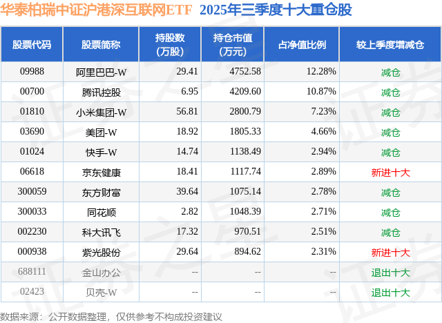从基金范围来看,华泰柏瑞中证沪港深互联网ETF基金2025年三季度公布的基金范围为3.87亿元,较上一期范围4.1亿元变化了-2306.0万元,环比变化了-5.62%。该基金最新一期金钱建树为:股票占净值比96.8%,无债券类金钱,现款占净值比4.7%。从基金抓仓来看,该基金当季前十大股票仓位达51.18%,第一大重仓股为阿里巴巴-W(09988),抓仓占比为12.28%。