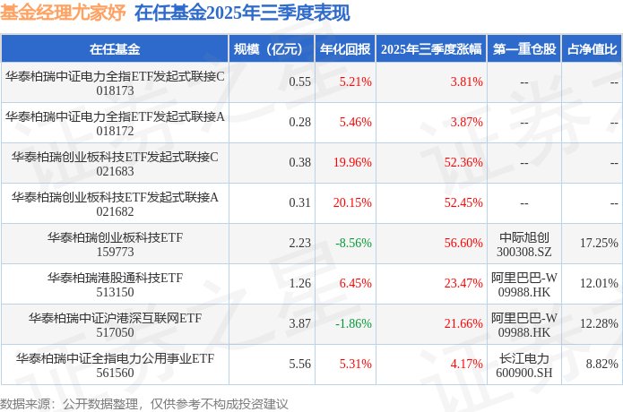 华泰柏瑞中证沪港深互联网ETF现任基金司理为尤家妤。其中在职基金司理尤家妤已从业0年又124天,2025年6月26日肃肃接办握住华泰柏瑞中证沪港深互联网ETF,任职时代累计答复为15.11%。现在还握住着8只基金家具(包括A类和C类),其中本季度发扬最好的基金为华泰柏瑞创业板科技ETF(159773),季度净值涨幅为56.6%。