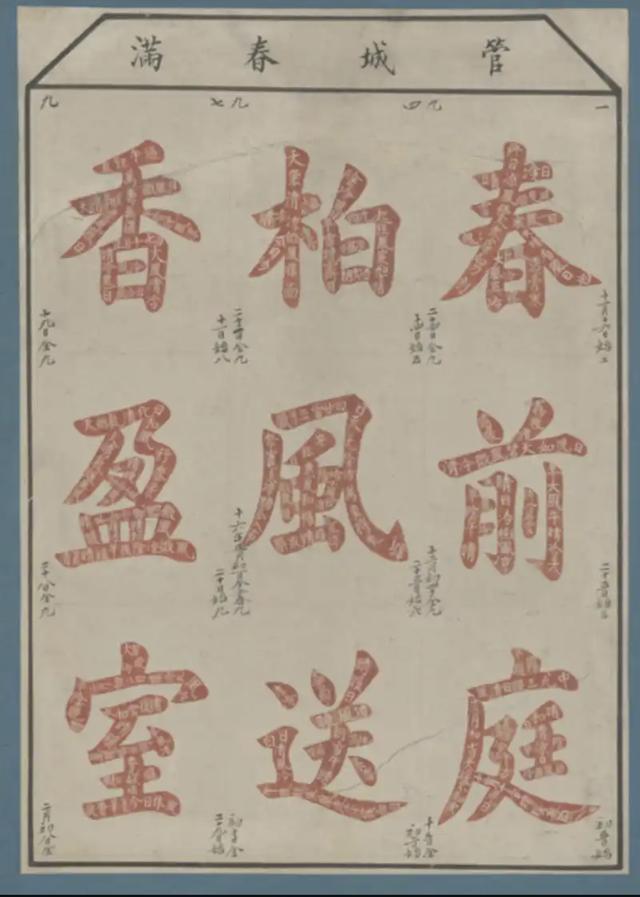 还有一种愈加文雅的消寒图——作九体春联。每联九字,每字九画,每天在高下联各填一笔,如上联写有“春泉垂春柳春染春好意思”,下联对以“秋院挂秋柿秋送秋香”,被称为“九九消寒迎春联”。