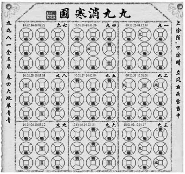 在一张白纸上画九个大方格,边上写一首“九九歌”。每个格子中间用圆筒形笔套蘸墨画上三排圆圈,每排三个,三排九个,九个大方格碰劲九九八十一个圆圈。从冬至开动,阐明每天天气情况在圆圈不同位置上“点九”。“点九”的口诀为:“上点晴、下点阴、左风、右雨、雪中心。”