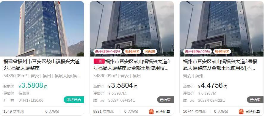 2024年底,中原银行于成为该福晟大厦产权的整个东说念主。另据悉,2023年8月及9月,福州市中级法院曾组织对其两次法拍,起拍价辩认约4.48亿元、3.58亿元,较那时评估价近6.4亿元已折价昂然,虽有万东说念主围不雅,但最终无东说念主接盘。
